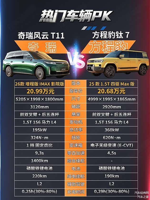 风云T11 2026款220后驱双IMAX影院版指导价为20.99万元,方程豹钛7 2025款190km四驱Max版指导价为20.68万元,两款车都面向家庭用户,价格也比较接近,哪一款车更值得入手呢?