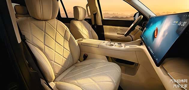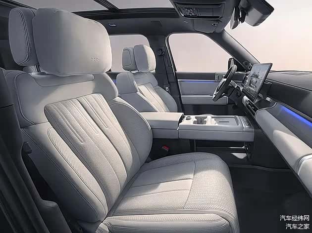 座舱采用双层环绕悬浮式仪表台设计,纯平的造型配合可开启的全景天窗,创造了开阔的车内视野。材质上大量使用软质包裹,配合金属饰条和精细的缝线工艺,营造出既有科技感又不失温馨的氛围。
