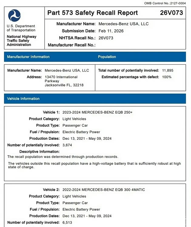 公告显示,由于高压电池存在内部短路风险,可能引发热失控甚至自燃,梅赛德斯-奔驰将在美国召回11,895辆2022至2024款EQB系列电动车。