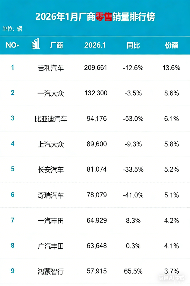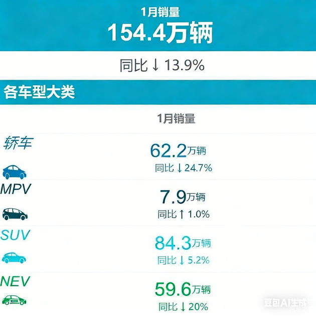 2026年的中国车市,开局并不美好。根据乘联分会最新发布的数据,1月份国内狭义乘用车零售销量仅为154.4万辆,同比下跌13.9%。今天,我们用最冷静的视角,扒开这组数据背后的真相。