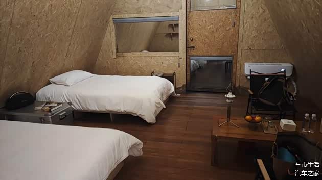 木屋内布置比较简洁,两个木床中间是个大铝箱充当床头柜,上面放着哈曼卡顿的音响,老板品味不错!