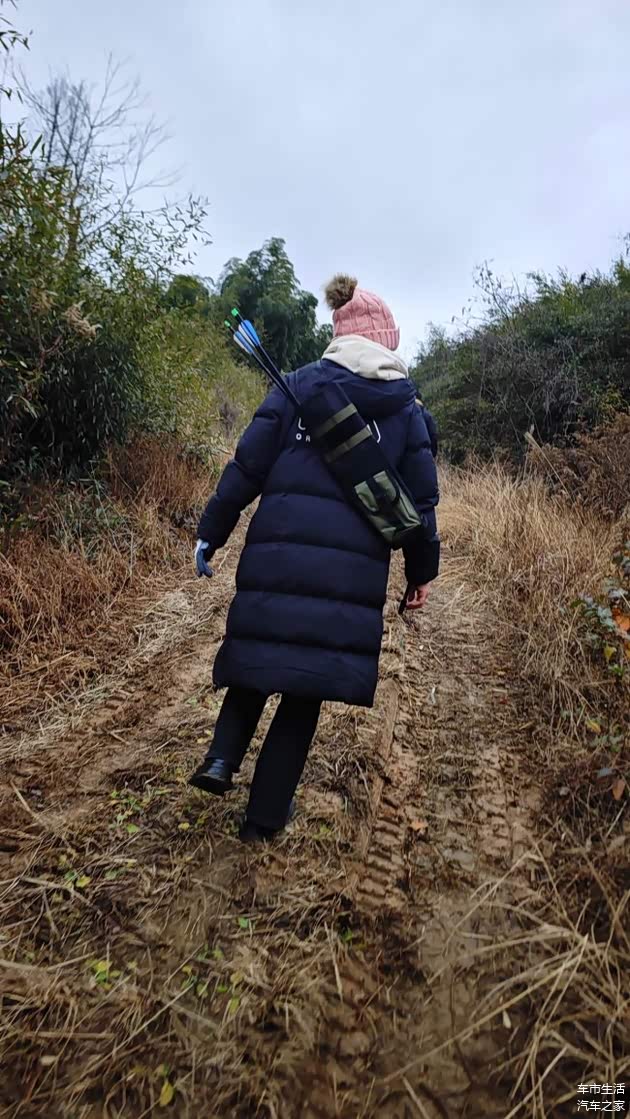 背上箭袋,拿上长弓,我们上山打野啦!可别说,这把铝合金制作的复合弓还真挺沉,拿在手里把玩一会还不觉得啥,但是拎着上山走一段山路可真是够呛,手都酸了!