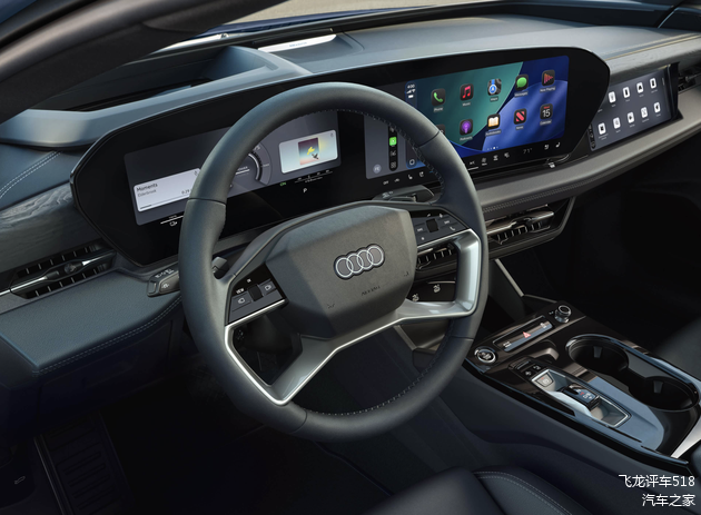 奥迪A6 Sportback e-tron车内采用了浅灰色软性材质铺陈,中控台和门板四周还加入了亮黑色钢琴烤漆装饰面板、碳纤维装饰面板以及绿色装饰条点缀,层次感丰富,也凸显出整车的高级质感。中控台配备了奥迪全新设计的四辐式多功能方向盘,中间是可发光的奥迪四个圈车标,两侧还原了物理按键,操控岛加入了小尺寸的推拉式换挡机构,其设计灵感源于Concept C概念车。科技感方面,该车配备了11.9英寸的液晶仪表屏+14.5英寸的中控屏+10.9英寸的副驾娱乐屏,主驾屏还采用了OLED曲面屏技术,同时还有HUD抬头显示系统。简化了车机显示界面,操作起来更加流畅。
