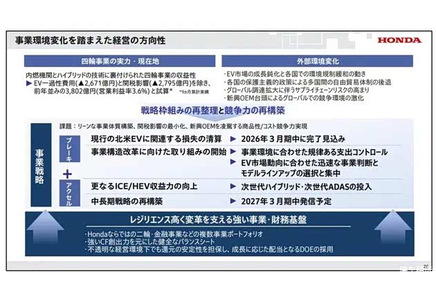 面对全球电动车市场成长趋缓及新兴OEM车厂的崛起,本田提出了针对四轮事业的结构改革方向。将重整北美电动车业务,目标是在2026财年内彻底清算现行北美电动车相关的潜在损失,以建立更精实的事业体质。产品线方面,将因应市场动向,对电动车型阵容与设备投资计划进行灵活调整与筛选。为进一步提升收益,将加速新一代混合动力系统的市场投放,并推进新一代ADAS搭载于油电混合动力车型。本田预计将于2027财年发布全新的中长期战略,以应对保护主义抬头与供应链风险加剧的全球局势。