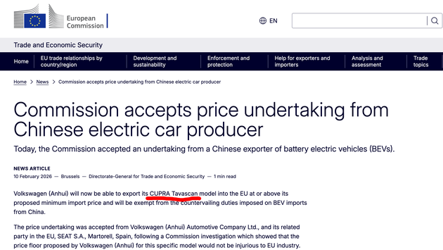 2026年2月9日欧盟委员会正式批准大众旗下品牌Cupra对安徽工厂生产的纯电动SUV Tavascan进入欧盟市场时免除额外的反补贴税的申请。简单来讲,之前Cupra Tavascan车型因为是在中国安徽工厂生产的,被加收20.7%的附加关税。连同基础关税,合计总税率高达30.7%。现在,欧盟同意免掉这20.7%的附加税。