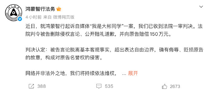 鸿蒙智行诉“我是大彬同学”案一审胜诉:获赔150万