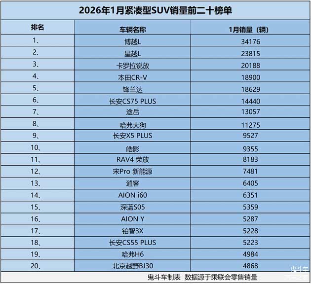 日前,乘联会发布1月份零售销量数据,鬼哥整理出1月紧凑型SUV销量排名前二十榜单,可以看到,1月份,共有8款紧凑型SUV零售销量过万,接下来,看看具体排名与销量表现。