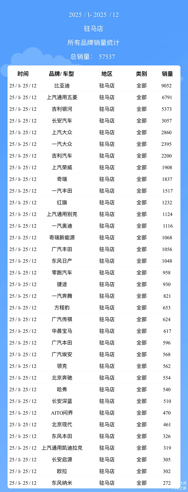 值得注意的是,从驻马店市2025年全年销量来看,排名前三的汽车品牌为:比亚迪全年销量9052辆,上汽通用五菱6791辆,吉利银河5373辆。这也进一步佐证了为什么近几年比亚迪、五菱、吉利银河的4S店会开拓到县区。