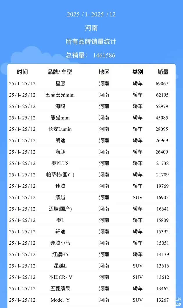 从2025年河南省全年汽车销量来看,微型电动车占据了显著的主导地位。其中,排名前三的是:吉利星愿全年销量69067辆,五菱 宏光MINIEV全年销量62195辆,比亚迪海鸥全年销量52979辆。