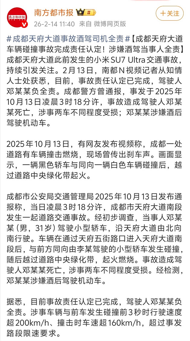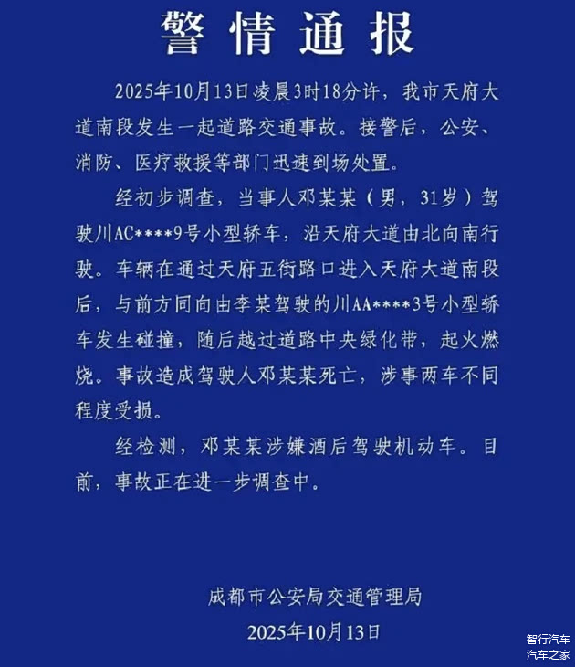时间拨回至2025年10月13日凌晨3时18分许,成都市天府大道南段。31岁的邓某某驾驶一辆 小米SU7 Ultra小型轿车,在通过天府五街路口后,与前方同向由李某驾驶的小轿车发生碰撞,随后车辆失控,越过道路中央绿化带并起火燃烧 。事故导致驾驶人邓某某当场死亡,两车不同程度受损。