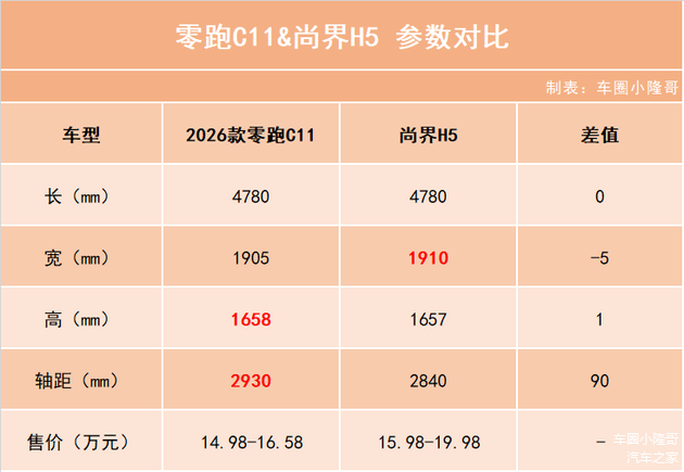 配置方面用料不足,零跑C11高配车型配备了腿托(副驾驶位)、Nappa真皮座椅和第二排座椅加热通风;而尚界H5的座椅材质全系采用仿皮,仅前排标配了座椅加热和通风,舒适性配置用料占比“略少于”零跑C11。