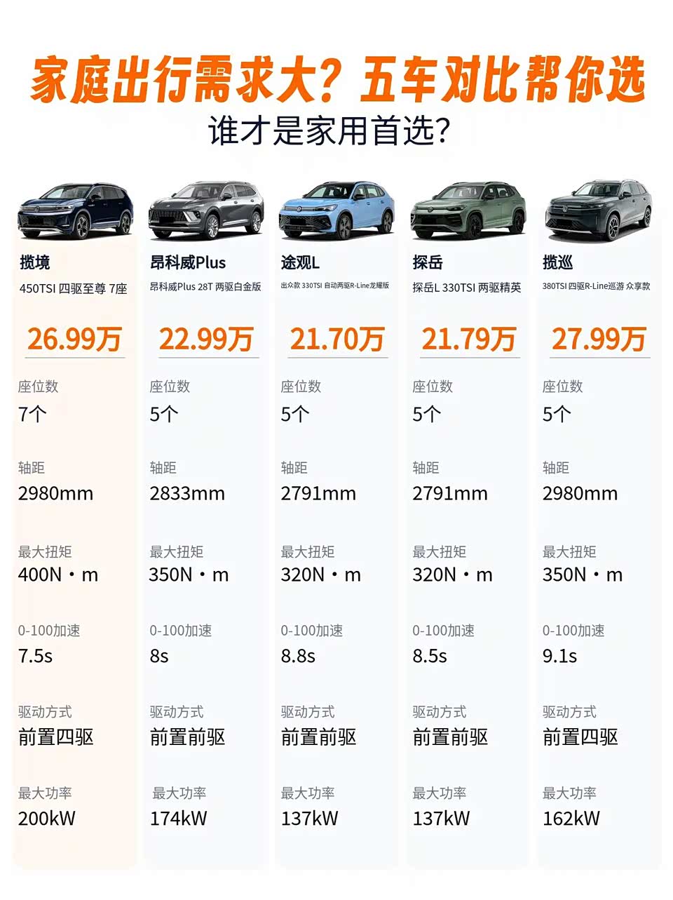 带爸妈看车时,销售一句“揽境第三排能跷二郎腿”让我当场愣住——毕竟昂科威Plus/途观L这些5座车后排也就勉强够用。结果实测发现:身高1.75米的老爸坐揽境第三排,膝盖离前排居然还有一拳!而探岳L和揽巡虽然空间不错,但少了两个座位(摊手)