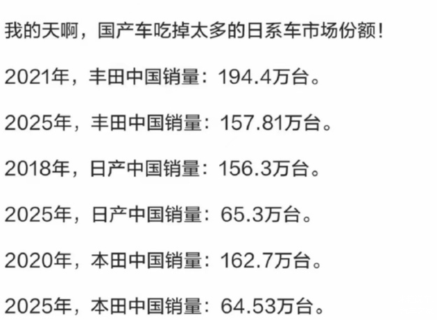 以前如果想购买一款汽车,要么是德系,要么是日系车为主,所以也看得出来当年的日系汽车在我们国内是如此的辉煌。事实上,汽车行业作为日本最后的堡垒,自然在这方面倾注了大量的资源,但是从近5年的销量情况来看,日系车在国内市场份额正在急剧下滑。2020年的时候,日系汽车品牌在国内占到了1/4左右的销量,达到了24%的占比。但是经过5年连续的发展,2025年我们国内日系车的销量跌至9.8%。事实上,日系车在国内的销量大幅度下滑,自主品牌新能源汽车全面崛起。