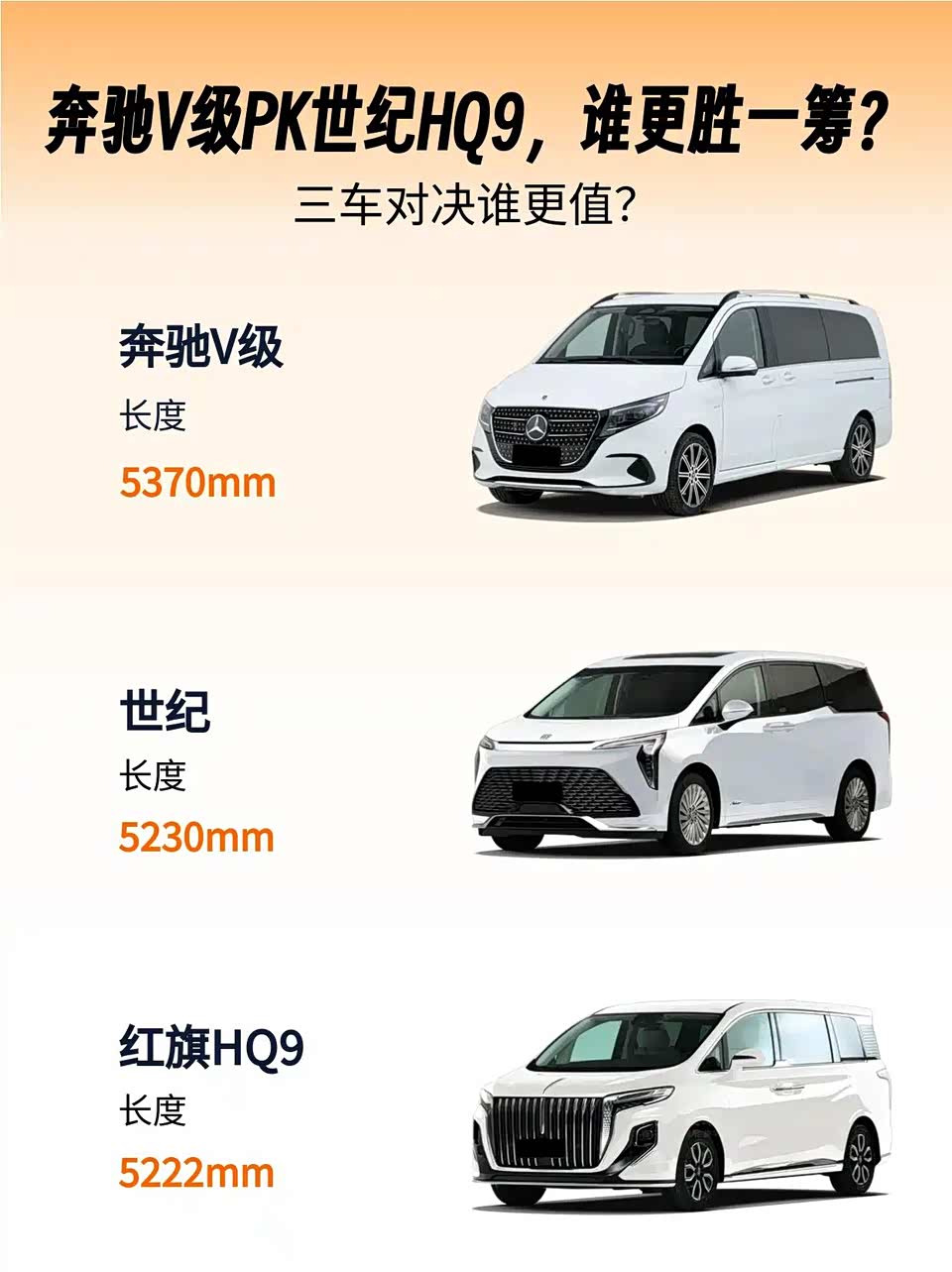总结:要品牌+全能选奔驰V级,追科技尝鲜选世纪,重性价比+国潮选HQ9。但V级那套原厂空气悬挂+商务配置,多花2万真的值!