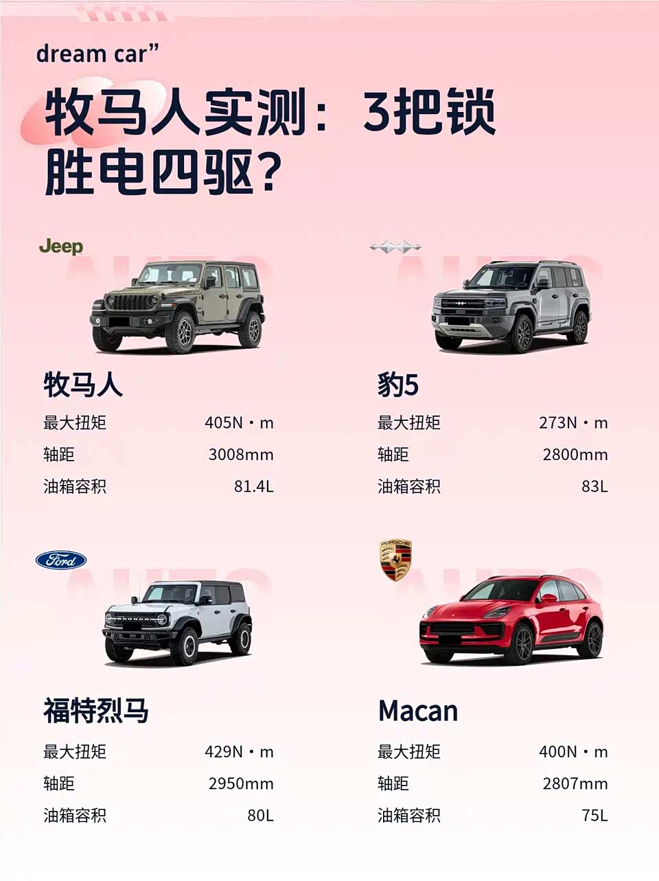 总结:硬核越野选牧马人,城野兼顾豹5更香,烈马适合改装党,Macan纯为品牌买单。你更倾向哪款?评论区聊聊!