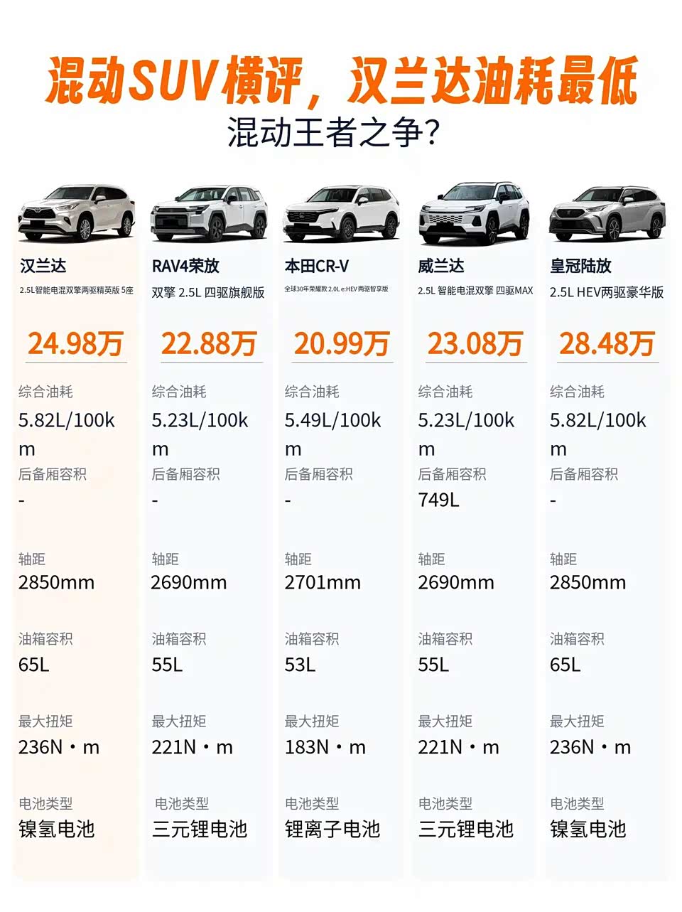 当初选2026款汉兰达2.5L双擎两驱精英版时,被疯狂吐槽:'这价位买RAV4荣放四驱旗舰不香?''本田CR-V混动油耗更低''威兰达配置更顶'…直到上周帮同事搬家,五台车停一起实测: