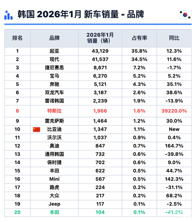 特斯拉和比亚迪2025年在韩国表现出色,2026年的开局也非常好,都保持在前十榜单。仅仅凭 元Plus和海狮7两款车型,比亚迪2026年1月的销量去到了1,347 辆。整体排名第10,进口车中排名第5。比起在这个市场深耕多年的沃尔沃和奥迪等传统汽车品牌来得更积极。沃尔沃销量为1,037辆。奥迪则为847辆。特斯拉在上个月的销量更是去到了1966辆。整体排名第8,进口车中排名第3。可以看到特斯拉和比亚迪正在重塑韩国进口车市场格局。对本土车企也造成了强的冲击。