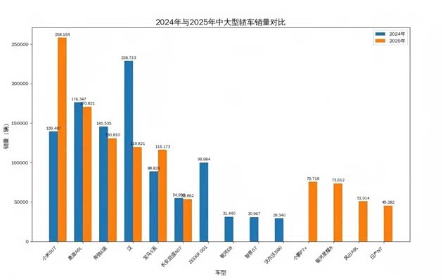 从2024年到2025年,排名前十的中大型轿车总销量从1025598辆上升到1095375辆,增幅约6.8%。从这个角度看,这个市场的总需求是相对稳定的,但总量的稳定不代表每个上榜车型的稳定。下面这张柱状图显示,极氪001、银河E8、智界S7和沃尔沃S90等四款2024年在榜车型到了2025年就被挤出了前十榜单,而代替他们的分别是小鹏P7+、银河星曜8、风云A9L和日产N7。10台车的榜单一年时间就换了4台,足以看出这个市场竞争之激烈。
