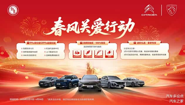 当然,对于东风标致和东风雪铁龙而言,让法系知音感觉“暖心”的服务从来不止于开业这一天。2025年11月,东风标致和东风雪铁龙推出“发动机终身质保”,为老车主吃下一颗定心丸。12月,“冬季暖心行动”如期启动,把专业检测送到车主身边,为广大车主排除冬季用车隐患。到了今年春节,47处“暖心驿站”出现在高速服务区和热门景区,专业技师为近2000个返乡返程家庭提供风窗防雾、轮胎胎压、蓄电池状态等免费安全检测,为春运路上的游子送上一份安心。更令人踏实的是400客服热线与技术援助团队的24小时值守,为有需要的客户提供“不打烊”的守护。此外,东风标致与东风雪铁龙自2月17日起,启动“春风关爱行动”,围绕用户春季用车养护需求,推出三重实用权益。用户仅需99元即可购得价值1399元的超享礼包,涵盖免费洗车、机油代金券、保养备件折扣、上门取送车、OBD车况检测、品牌免费救援等实用项目,将单次服务转化为长期价值回馈,让用户在日常用车中持续感受省心、省力、省钱的守护体验。