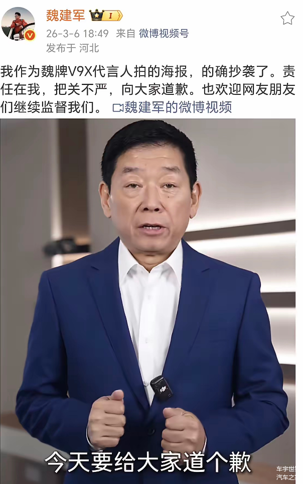 魏牌V9X新车海报被指抄袭,魏建军不作任何辩解并致歉