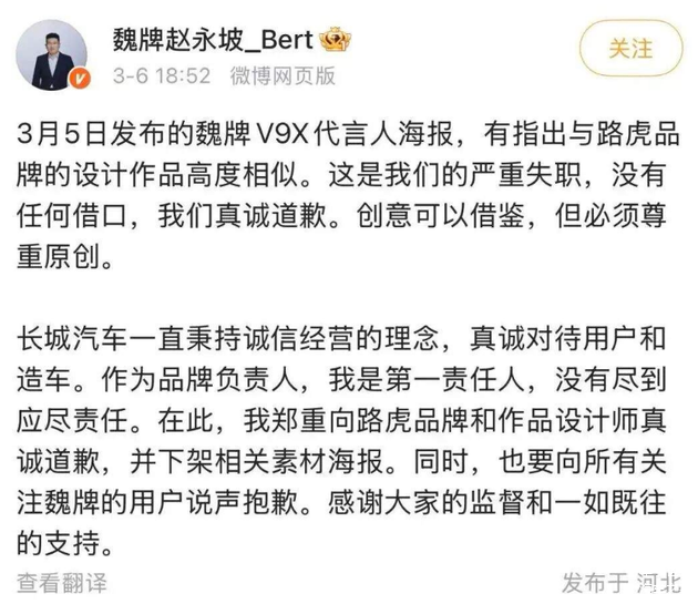 紧接着,魏牌CEO赵永坡也发文补位道歉,称这是“严重失职”,并强调“创意可以借鉴,但必须尊重原创” 。