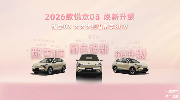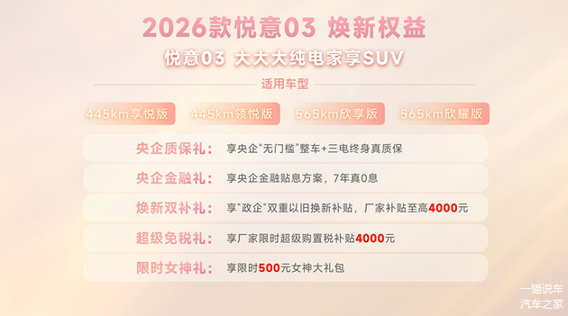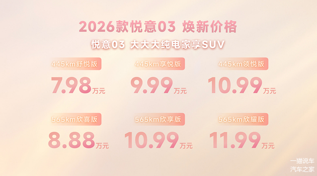 3月8日妇女节,2026款 悦意03正式焕新上市,精准贴合家庭用户核心需求,推出445km、565km两种续航共6款车型,官方售价7.98-11.99万元,同步带来诚意满满的购车权益:7年0息贷款大幅降低拥车门槛,无门槛整车及三电终身质保、零燃保障打消养车顾虑,叠加政企以旧换新补贴至高4000元、限时购置税补贴等五重礼遇,让年轻家庭无需妥协,就能轻松开启高品质纯电生活。作为一汽旗下重磅纯电车型,这款年度改款车型凭借20余项升级,打破10万级纯电家用SUV“配置与品质不可兼得”的魔咒,重新定义细分市场价值标杆。