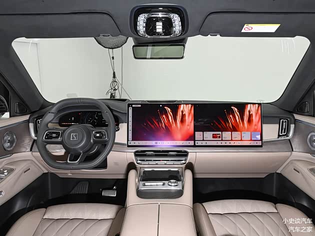 进入车内,内饰以豪华奢享为核心,打造环抱式座舱,座舱采用简约大气的设计风格,兼顾科技感与人性化,配备贯穿式连屏设计,由两块16英寸屏幕组成,搭配AR-HUD抬头显示,视觉效果出众。细节处凸显贴心设计,采用怀挡式电子档位,中央扶手台两侧有宽大扶手,保留一排实体按键,配备双手机位与中央大旋钮,操作便捷。空间方面,主打大五座布局,可选2+2+2六座布局,搭配3069mm长轴距,带来充裕的驾乘体验。大五座版本后排腿部空间舒展,180cm乘客可轻松伸直腿部,右侧配备零重力座椅,开启后前排座椅自动前翻腾出空间,实用性拉满。