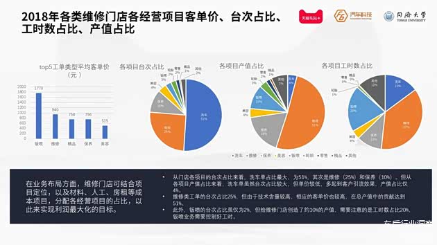 从门店各项目的台次占比来看,洗车单占比最大,为51%,其次是维修(25%)和保养(10%)。但从各项目产值占比来看,洗车单虽然台次占比较大,但单价较低,多起到客户引流效果,产值占比仅4%。维修类工单的台次占比25%,但由于技术含量较高,相应的客单价也较高,在总产值中的贡献达到51%。