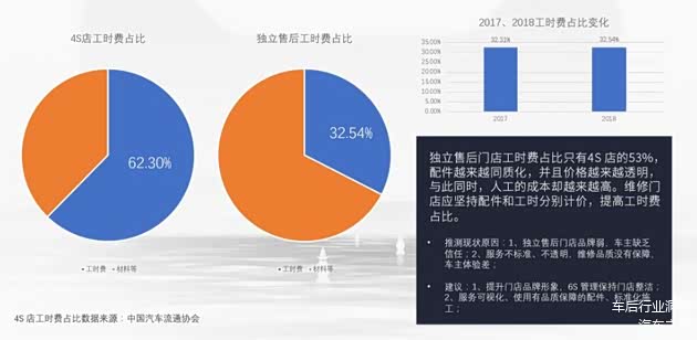 独立售后门店工时费占比只有4S点的一半(53%),仍有上涨空间,如何让技术和服务“值钱”是门店发展方向;