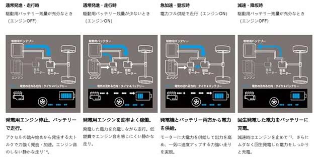 当电池能量充足时,NOTE e-Power和一台纯电动车无异。当电池能量不足时,发动机开始运转一边通过发电机向驱动电机传输动力,一边向电池充电。如果车辆遇到上坡、急加速等高负荷工况时,增程器和电池同时向驱动电机提供能量。遇到下坡、滑行等工况时,驱动电机通过逆变器为电池充电,起到类似于动能回收的作用。