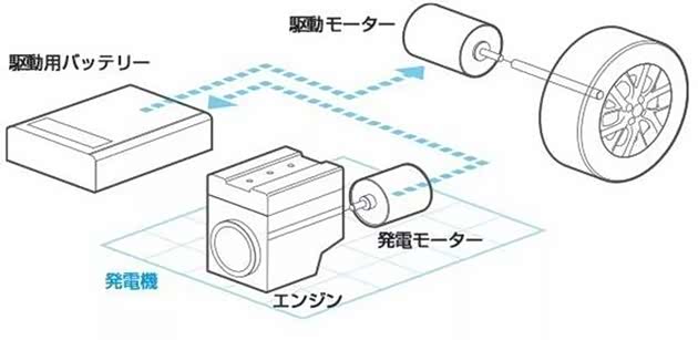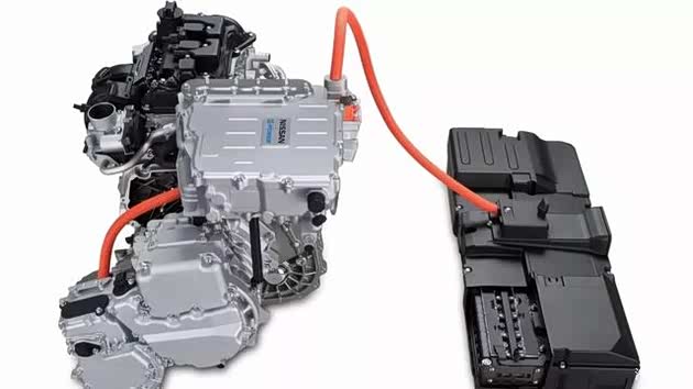 日产e-Power采用串联混合动力形式,一台1.2L HR12DE三缸发动机驱动发电机发电,向电动机输送动力,多余能量可存入电池中。