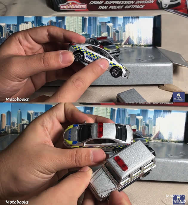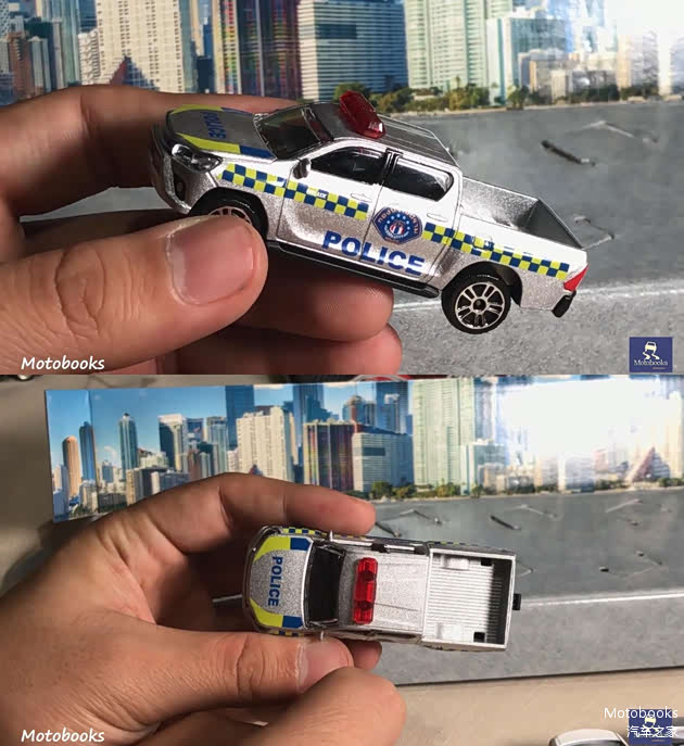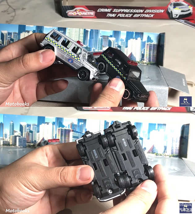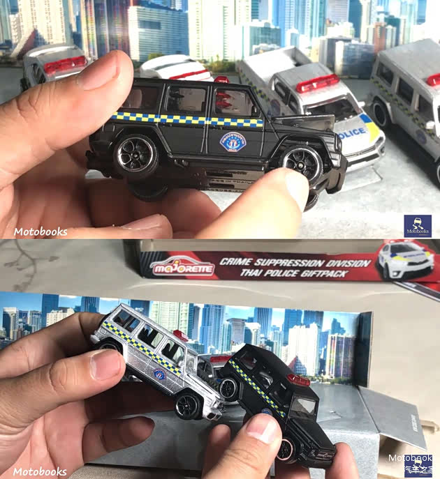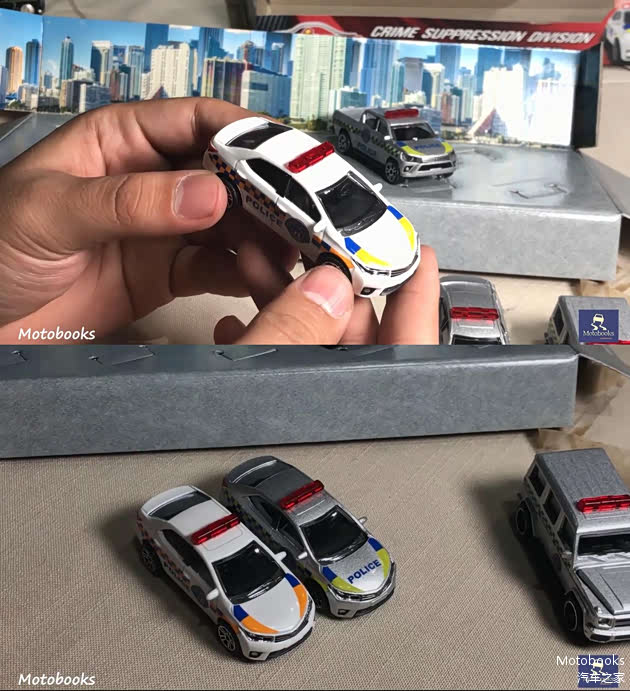 其中梅赛德斯-奔驰 AMG G 63 是可以打开引擎盖的 - 一台消光黑一台金属银色 - 再套上“警服”显得霸气外露!“大 G”和丰田 Corolla Altis 的比例都是 1:61,放在一起还算协调(同组的丰田 Hilux Revo 皮卡比例则为 1:58)。相对来说 Majorette 比不标注比例的 Hot Wheels 更接近“模型”设定。