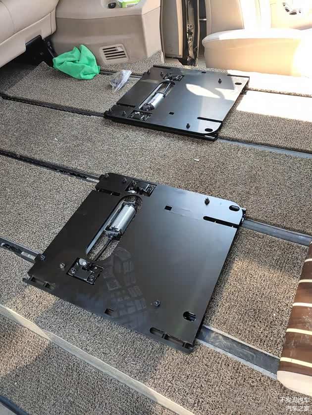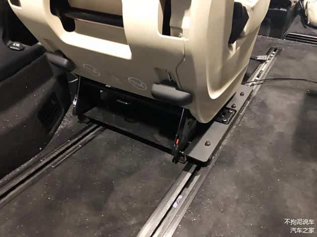 其实原理很简单,我们都知道,奔驰V级和高配威霆的原车座椅是安装在地板的四条滑轨上。而这套机构之所以能让两张座椅向两侧偏置,就是因为这套机构本身是偏置的。它先通过四颗螺钉固定在原车的滑轨上,然后再将座椅安装在它上面,因为这套机构上的座椅安装卡槽相对于滑轨是偏置的,所以座椅才得以偏置。这套拓宽机构其实就相当于是一个转接过度,通过这个转接才让座椅相对于滑轨的位置发生了偏移。