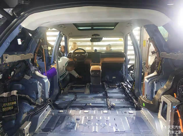 而在机舱上方,两条环抱式结构的上纵梁引起大家的注意,这个设计可以加强小角度偏置碰撞的防护能力,可在发生碰撞时及时的将车辆弹至安全区域。对于相对薄弱的侧面防护,蔚来ES8在地板处设置了6条贯穿式的横梁,加强对于两侧车身的碰撞防护。此外,在门槛位置该车也设置了相对较宽大的门槛梁,旨在加强全铝车身与自身重量所需的防护强度。在追尾部分,可以看到后防撞梁与后围板均受到撞击,同时还可以观察到围板更换后的人工涂装痕迹,涂胶痕迹较严重,与机械手臂的工艺还是相差较远。