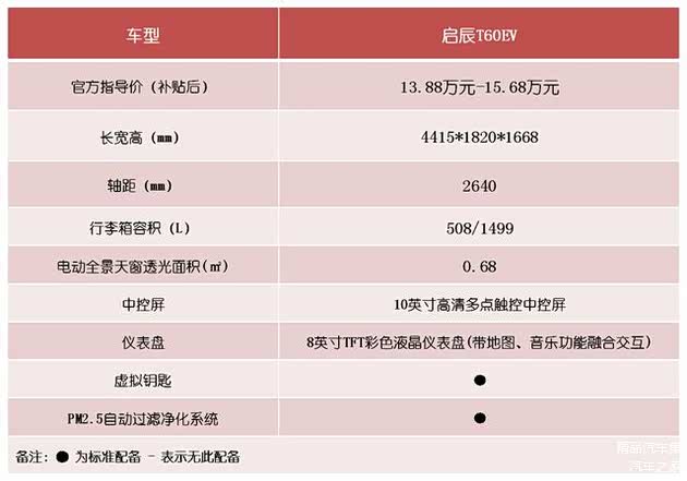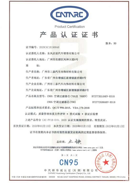 启辰T60EV的PM2.5自动空气净化系统被权威机构中汽研华诚认证中心评为"车规级CN95滤芯",证明启辰T60EV"健康座舱"获得了专业的认可