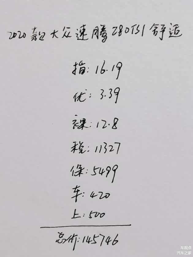 我们选择的是2020款280TSI自动舒适型,这款车指导价16.19万,当地汽贸店给我的裸车价是12.8万,加上购置税11327,保险5499,车船税420,上牌500,全款落地价145746元,选择了3000元的舒适包,全部下来不到15万,价格还是非常满意的。