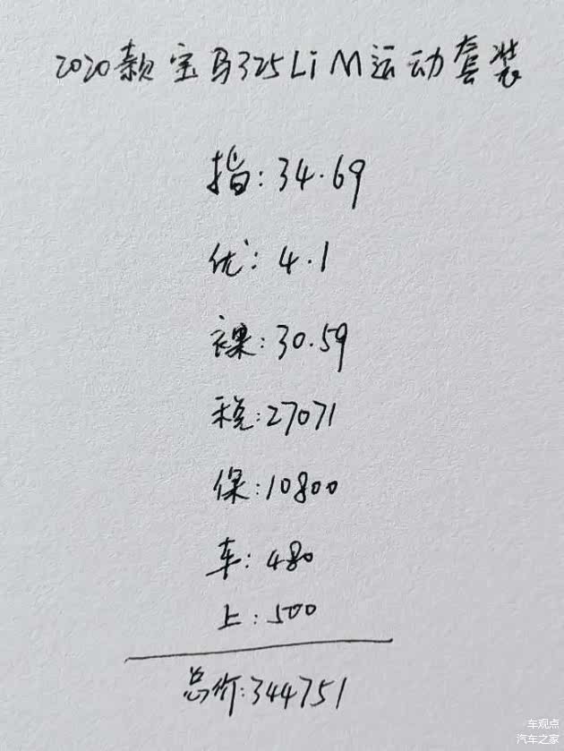 经过对比配置后个人其实更喜欢短轴版的外观,但是考虑到平时老婆小孩也坐车,空间有点小,还是选择了2020款宝马3系325li M运动套装,这款车指导价34.69万,4S店给我的裸车价是30.59万,加上购置税27071,保险10800,车船税480,上牌500,全款落地价344751元,价格也还是可以接受的。