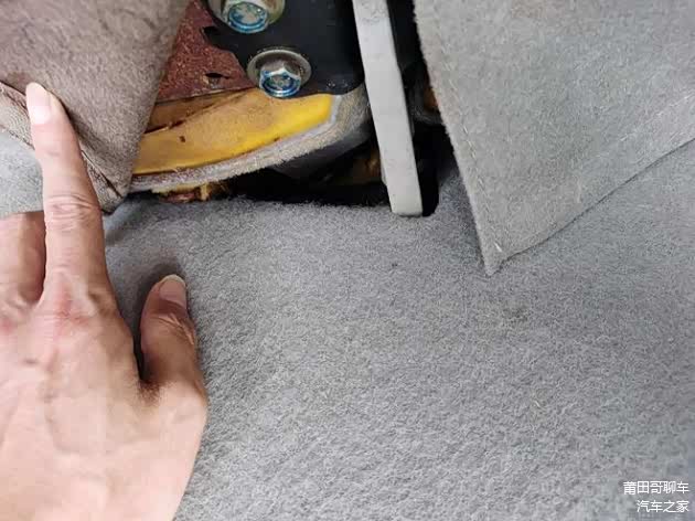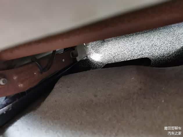 小编观察后排座椅绒布有人撕开过痕迹,于是小编顺手也翻开查看,真是吓了一跳,锈迹斑斑,车子泡水嫌疑加大了!