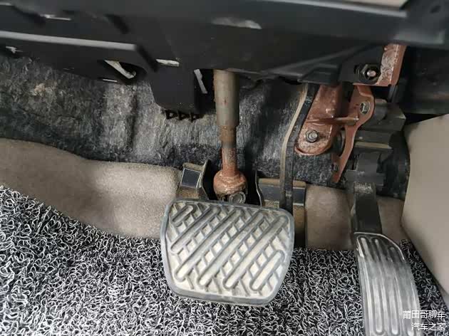 低头观察转向柱和刹车油门支架,都有明显生锈痕迹,还不是那种环境潮湿的浮锈,而是那种泡水的锈屑。