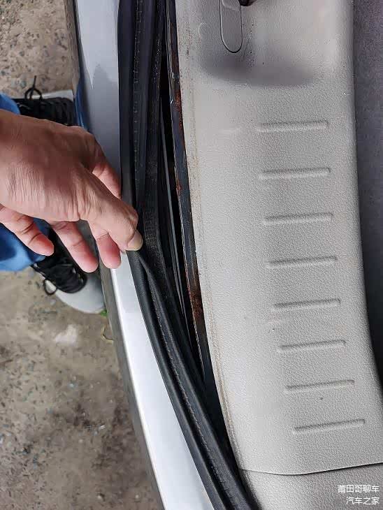 小编拉开后围板胶条,发现后围板存在敲打修复痕迹,目前已经锈迹斑斑。看来这次追尾导致后尾盖更换,后围板轻微变形。