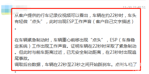 11月21日,顺义店的技术经理告诉阿星,他承认视频中确实有刹车声音,是车身稳定系统介入后产生的。但事故原因,是车主踩刹车踩得太晚了,不足以刹停车辆,才导致追尾的。