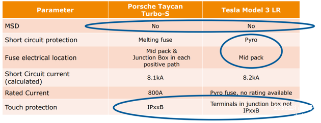 这一页是有关Taycan和Model 3在电气安全的设计差异,其实可以理解在相似的功率输出下,特斯拉只能采用Pyro Fuse完成短路保护,否则这么大电流下很难和最大额定电流进行区分。