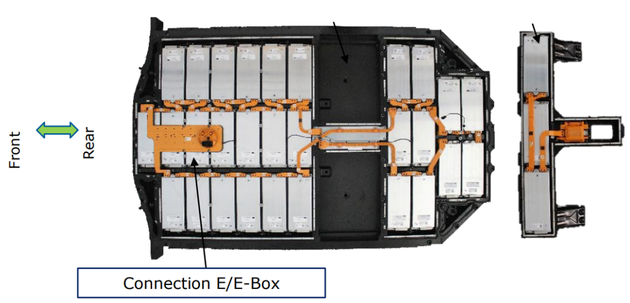这些高压组件成为高压E组件集成在高压压铸的盒子里面,配置在电池的前部,这个配电盒配置了一个绝缘的塑料底座。