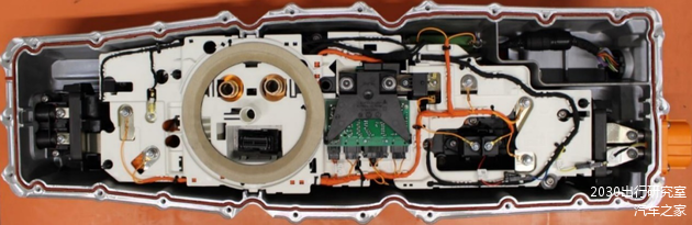 下面的这个高压配电盒通过类似之前e-tron的对插连接方式,可以相对有效的完成组装,通常在自动化以后,这个大盒子可以通过从上往下插的工艺来实现自动对位。