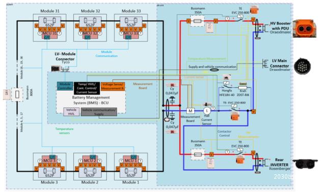 从总的电气保护来看,这里有三根熔丝,采用巴斯曼的800A的作为半包保护(main path fuse SMC);充电输入采用巴斯曼的350A熔丝(HV Booster with PDU),后驱动也采用350A的熔丝(Inverter rear)。
