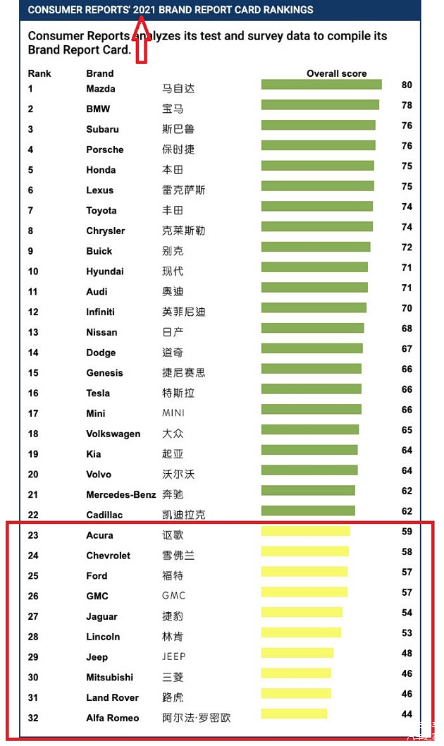 导读:随着汽车行业不断发展,消费者对汽车质量也是愈加重视。而在前不久,由美国权威汽车评测机构《消费者报告》发布的2021年汽车可靠性排名,也是引起了广大消费者们的关注。而根据榜单来看,上榜的32个汽车品牌当中,有10个品牌的可靠性得分是低于60分的,也就是说它们的可靠性表现较差。而令人比较意外的是,整体表现一直不错的美系车,此次却意外霸榜,像雪佛兰、GMC、林肯以及Jeep等知名品牌,它们的可靠性表现都不是很好,另外日系车讴歌和三菱也惨遭点名。美媒公布可靠性较差的十大汽车品牌:美系车霸榜,三菱福特也入选!