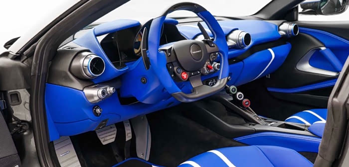 车辆内部是较为耀眼的蓝色皮革,与之形成鲜明对比的是与各处的白色装饰形成对比,从而在某种程度上减轻了视觉冲击力。Mansory添加了一些碳纤维装饰条和定制的铝制踏板,以进一步将812 GTS与标准配置区分开来。