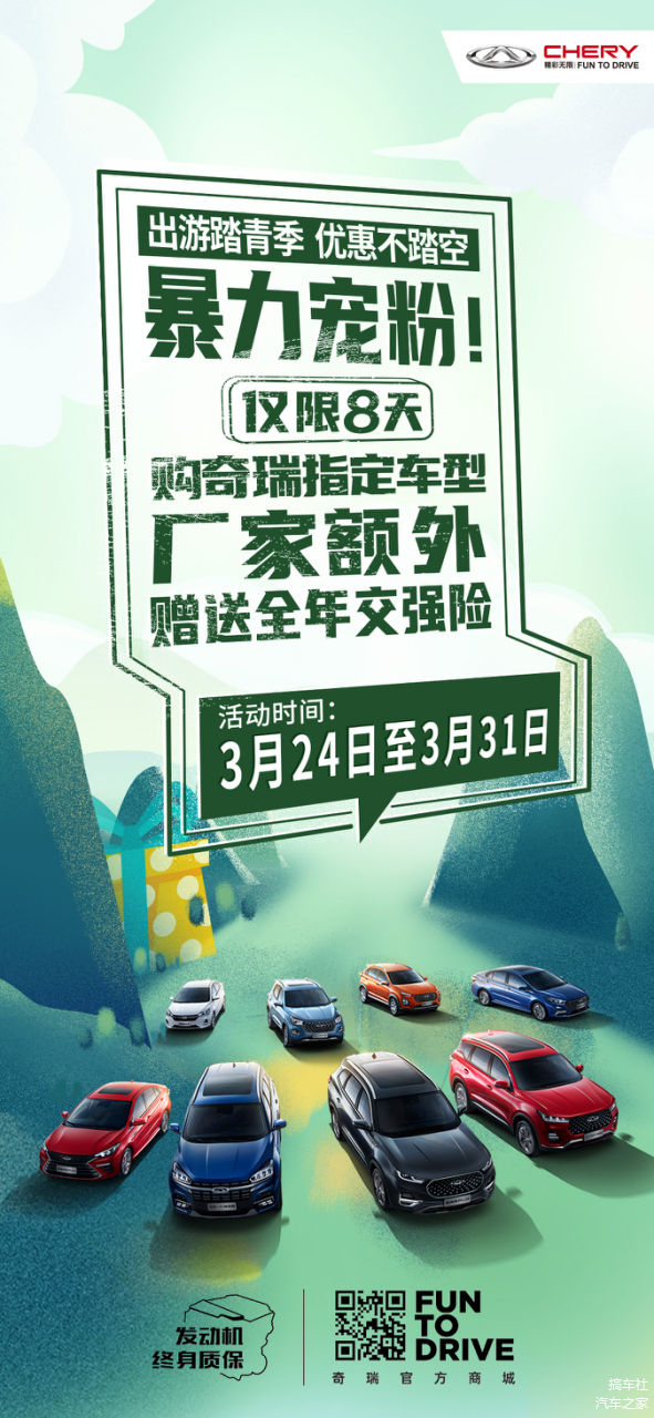 3月24日,奇瑞汽车公布重要通知,即日起至3月31日期间,购奇瑞指定车型厂家额外赠送全年交强险。此次“买车送交强险”政策,是奇瑞汽车继今年2月22日实施“全系车型发动机终身质保”后又一重磅福利,旨在进一步回馈广大用户,让消费者可以在出游踏青季,用更优惠的购车成本,更快、更轻松地享受高品质生活。