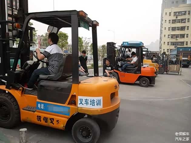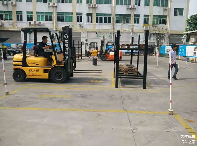 实际操作培训是在另一个地方,一个类似于驾校科目二场地,一台五吨手动档叉车做教练车。要求是在一个规定的路线上往返四次,并将两个货物分别装上和卸下,还有坡路起步,也是有一定难度的。如果没有驾驶经验的人,是很难在短时间内学会的。在培训时有一个小伙子,从来没有摸过车,刹车油门分不清,上去就把装货物的铁架子撞翻了,还差点把教练给撞了。后来这个人单独练了很长时间才勉强通过。
