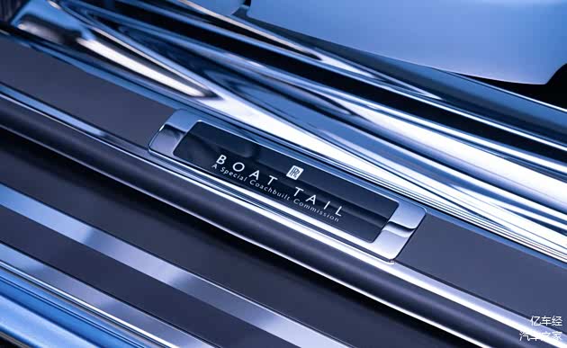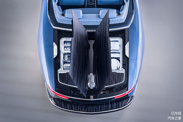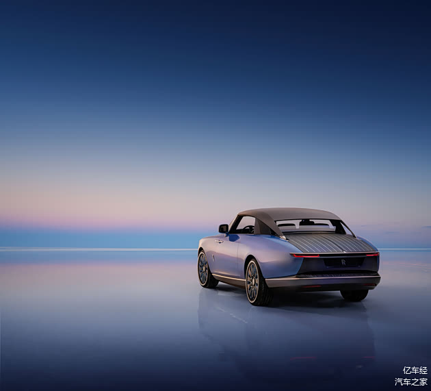 该开孔材料上辅以线性木质纹理,同时镶嵌不锈钢拉丝细条凹纹在视觉上营造出拉长效果,令该车型在外观上致敬游艇经典的木质结构。劳斯莱斯木材专家利用高超的打磨技艺使木纹拼花与车型的几何轮廓保持和谐一致。该饰板一直延伸至车后,在车尾以锥形收束。干净利落的断截设计所蕴含的,是对经典“浮影”车身致以的敬意。